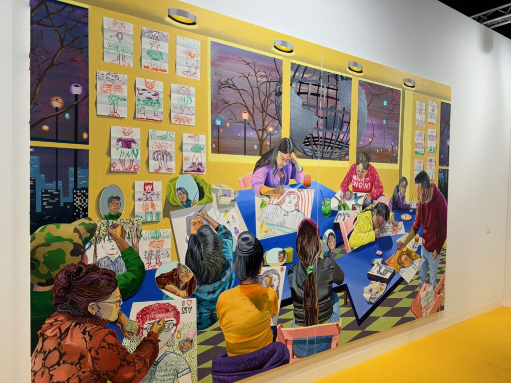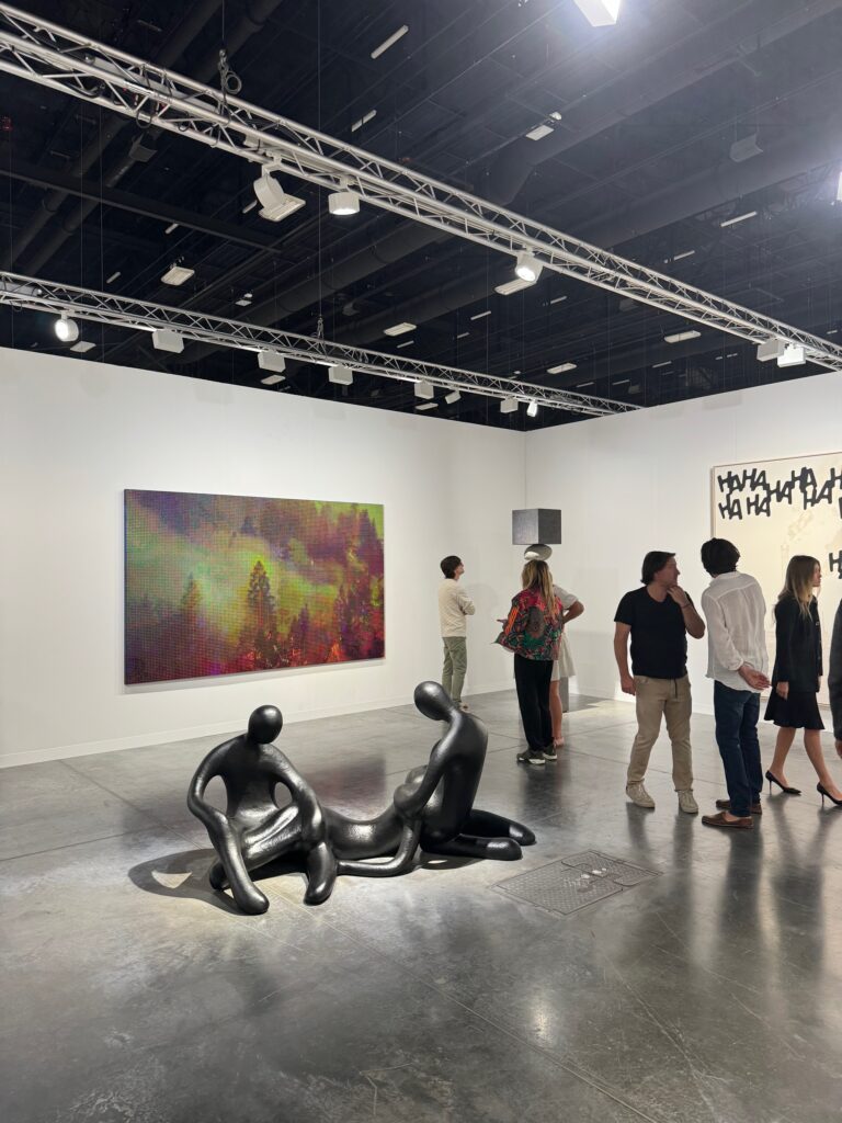 Marlene Dumas’s 1987 “The Schoolboys” from the David Zwirner gallery fetched an astounding $9 million as female artists continue to rule with Zwirner reporting heavy interest in Yayoi Kusama with two of her 2015 “Infinity Net” paintings selling for $3 million and $3.2 million. Despite the highly charged Israel-Hamas issue that has swept the art world with Jewish collectors shunning pro-Palestinian artists the fair remained politically neutral with sanguine florals heavily on display. One of my favorite paintings was Aliza Nisenbaum’s 2023 “El Taller at the Queen Museum” presented by the Anton Kern gallery that featured her students busily painting self portraits with alternative views as to what they represented-the vibrant colors and intricate facial details were mesmerizing.