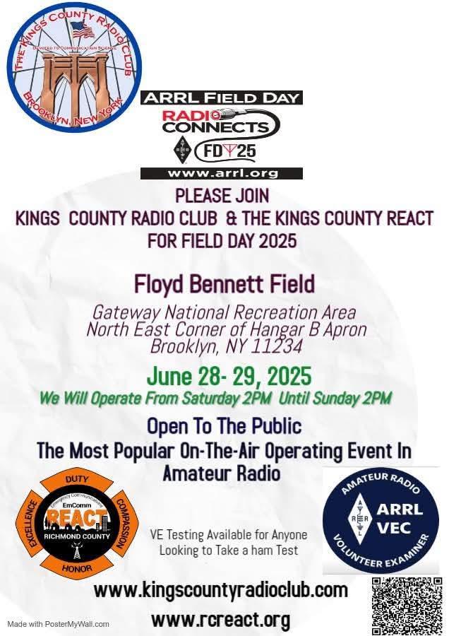 The countdown to the 2025 ARRL Field Day has officially begun. The event—regarded as the crown jewel of the amateur radio calendar—will unfold over the weekend of June 28–29, bringing together tens of thousands of operators from across the United States and Canada. Among the most anticipated gatherings is the activation site at Floyd Bennett Field in Brooklyn, New York, where The Kings County Radio Club and Kings County REACT will co-host a robust Field Day operation.
