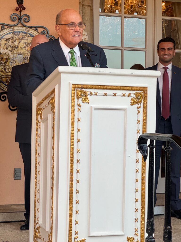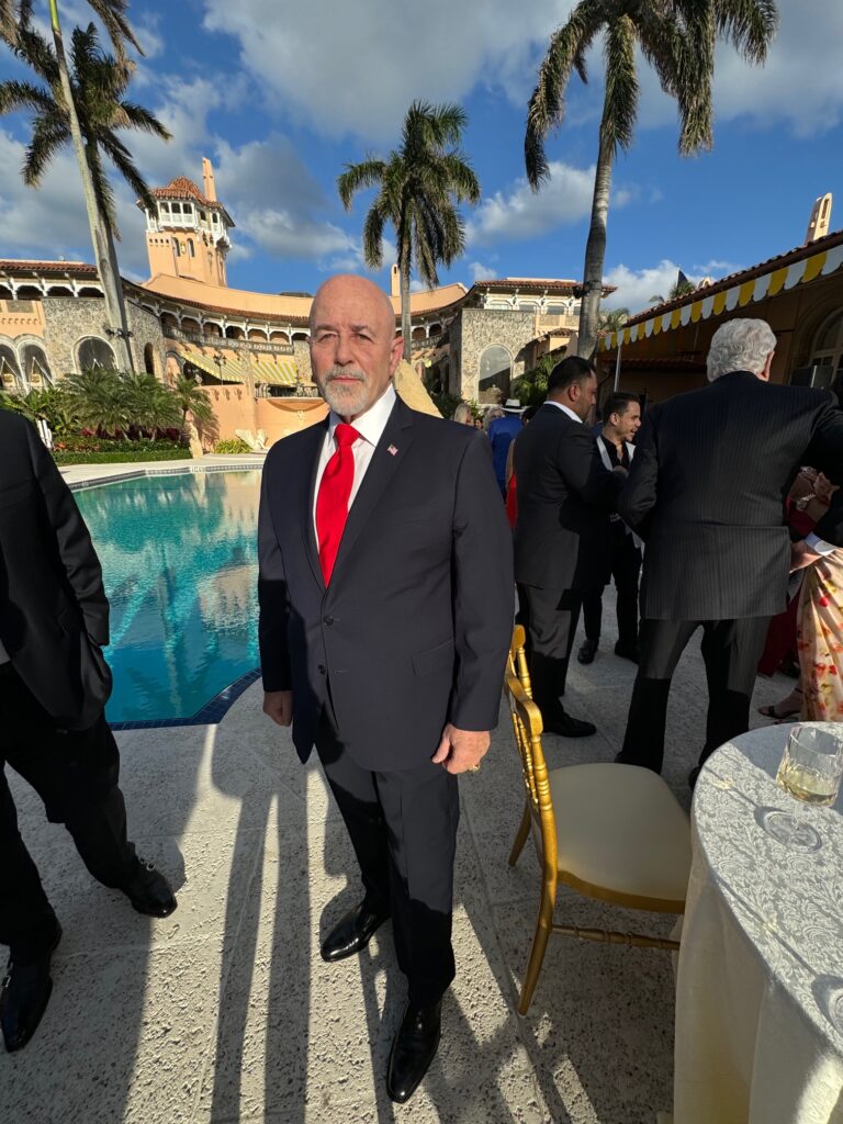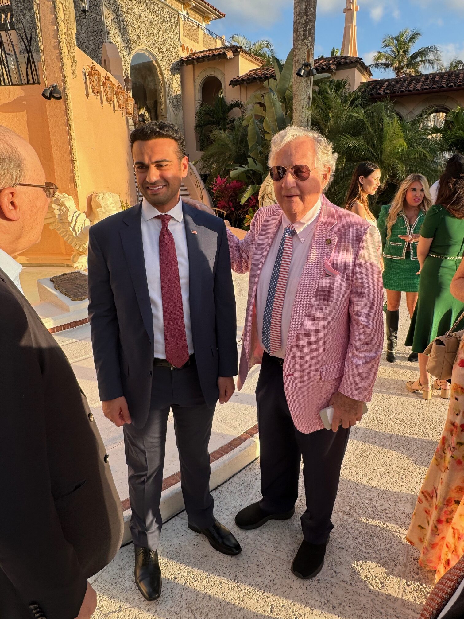 With Mar-a-Lago as a backdrop along with the crisp eighty degree weather, Guilfoyle magnanimously greeted Republican backers including former ambassador to Germany Ric Grenell who has a 1.2 million Twitter following. Along with the cross on his neck the Christian Grenell has started wearing a star of David to show his support for Israel and Judeo-Christian values and remind himself of the 136 hostages being held by Hamas. Grenell, began the evening extolling the 33-year-old Hamadeh as an Arab voice with sanity someone who unequivocally supports Israel and Trump -the Alexandria Ocasio Cortez squad’s nightmare.