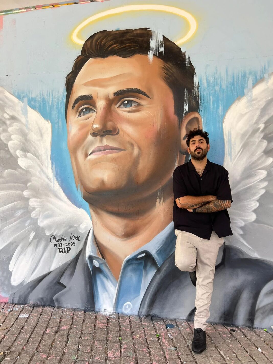 The mural, completed in record time, portrays the conservative American activist with a glowing halo above his head and a pair of angelic wings stretching wide behind him. To Shoval, this was not merely a work of art but an act of mourning, defiance, and remembrance for a man he described as “one of the world’s most brilliant and unique people.”