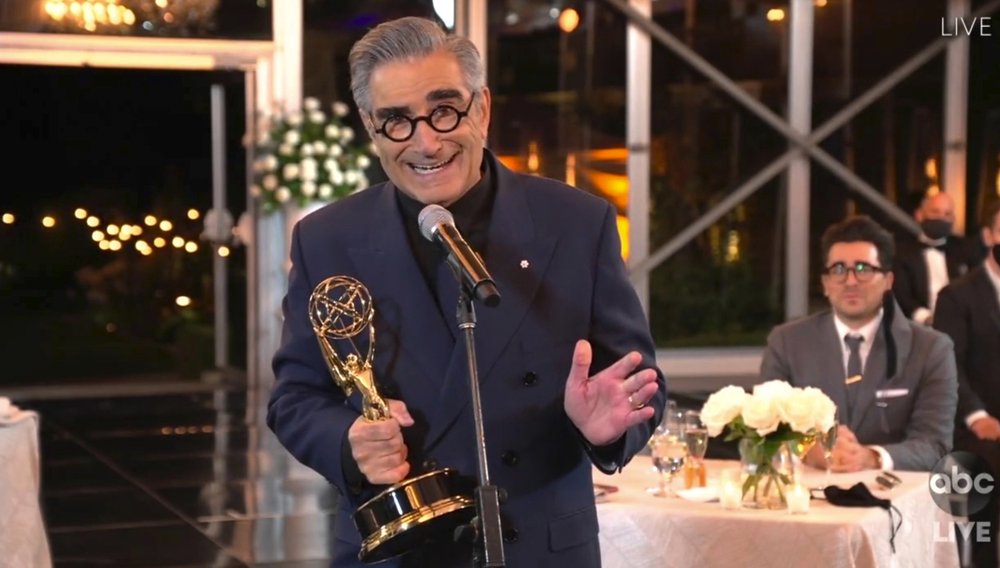 AP reported: “Schitt’s Creek,” the little Canadian show about a fish-out-of-water family, made history at Sunday’s Emmy Awards with a comedy awards sweep, something even TV greats including “Frasier” and “Modern Family” failed to achieve.