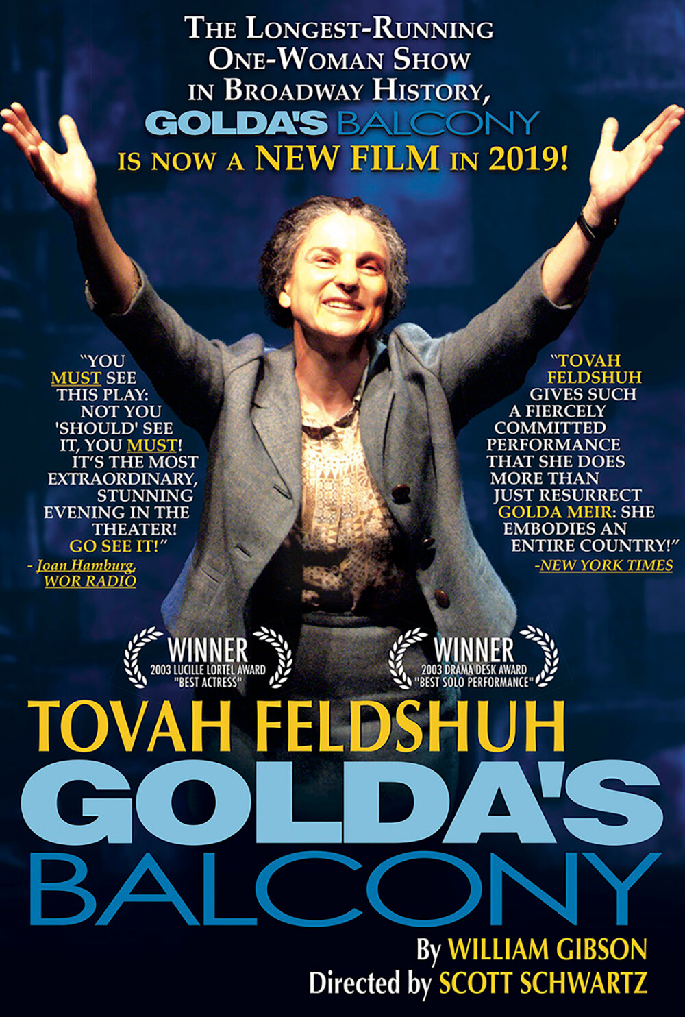 Tovah Feldshuh recreates her award-winning performance as Golda Meir (and, stunningly, 43 other characters) in Golda’s Balcony, The Film as this final masterpiece by the author of “The Miracle Worker,” William Gibson, makes its motion picture debut in 2019. A rare, multi-camera shoot from the play’s original run was recently unearthed (literally, from a safe) and assembled into a new but absolutely riveting motion picture.