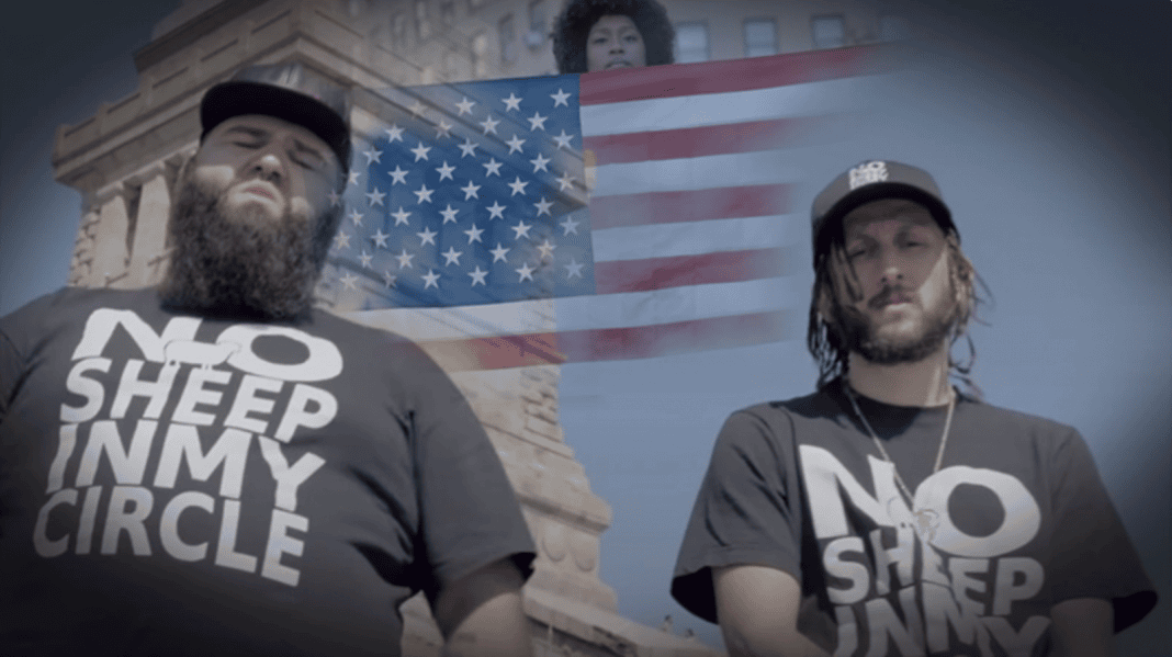 In the music video, rapper Hi-Rez and singer Jimmy Levy sport shirts reading, “No Sheep In My Circle,” while marching with anti-vaccine passport protesters in NYC.