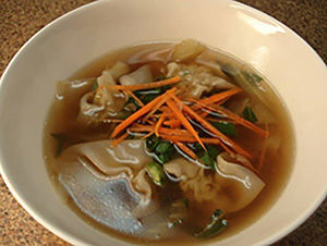 Return strained broth to clean saucepan and bring to boil. Carefully add wontons, carrot and scallions and simmer until wontons are tender, about 5 minutes. Serve.