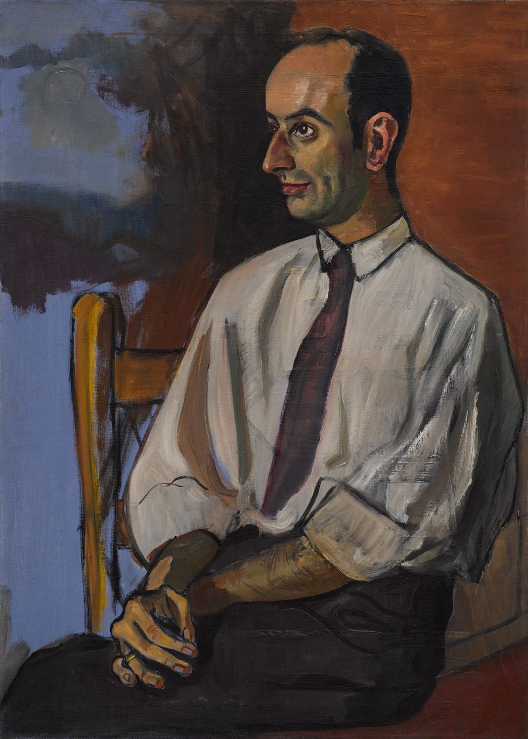 One of the most iconic figurative painters of the 20th century, Alice Neel created portraits of her friends, family, neighbors, and acquaintances which are immediately recognizable for their observational mark-making. The passage of time and the artist’s empathetic consideration of her subjects is palpable in the immediacy of her brushstrokes. Georgie Neel (1955) is a portrait of the artist’s brother’s son. Angled away from the artist as she painted him, Georgie sits on a chair with an earnest expression and hands folded in his lap. This is one of Neel’s more rendered portraits; while the background is suggested in washes of blue and umber, careful highlights on Georgie’s forehead, nose, and ears reflect the quality of light in the room around them.