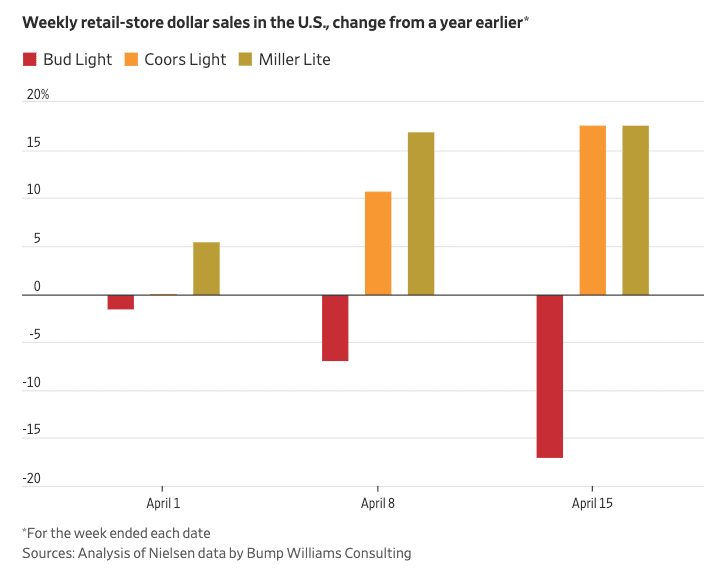 The Wall Street Journal posted a chart showing the lurch downwards in Bud Lights sales — and the lurch upwards in sales of rival beers Coors Light and Miller Light: