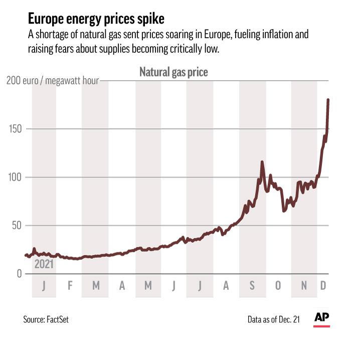 Rising prices for oil and natural gas unsettled the global economic recovery in 2021. The biggest crunch came in Europe, where by December natural gas prices had soared more than nine times their level at the start of the year amid fears that reserves would run out in a colder than average winter. Energy prices spilled over into geopolitics as Russian President Vladimir Putin cited Europe’s gas shortage to push for final regulatory approval of the contentious Nord Stream 2 pipeline. Amid tensions over Russian troop movements near Ukraine, U.S. Secretary of State Antony Blinken said it was “very unlikely” Nord Steam gas would flow if Russia attacked.