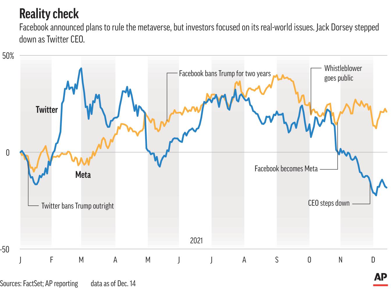 Social media companies had an eventful year, starting with Twitter and Facebook banning then-President Donald Trump from their platforms after the Capitol riots. Later in the year the debate over social media’s impact on the public exploded when Facebook whistleblower Frances Haugen leaked tens of thousands of damning internal documents about the harm the company is causing to its users around the world. Amid the fallout that has included congressional hearings, Facebook rebranded itself Meta Platforms, reflecting its commitment to developing the metaverse. CEO Mark Zuckerberg described the metaverse as a “virtual environment” you can go inside of — instead of just looking at on a screen.