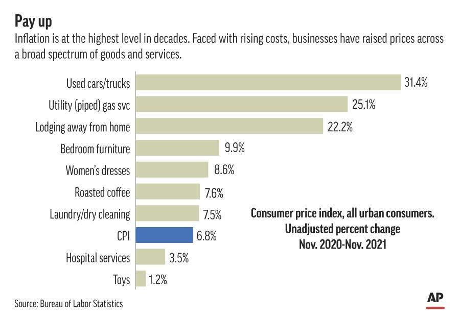 Inflation awoke from a long slumber in 2021. The U.S. government’s consumer price index skyrocketed 6.8% in the 12 months that ended in November — the sharpest such jump since 1982. The speed of the global economic recovery surprised businesses, which had laid off workers, let shelves and warehouses go bare, and cut factory output when the coronavirus pandemic first hit. They’re still struggling to catch up with demand, creating supply bottlenecks and higher costs for raw materials and finished goods.