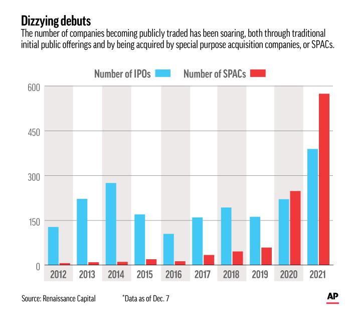 Initial public offerings exploded in 2021 as companies sought to take advantage of a soaring stock market. There were 389 IPOs through the first week of December, easily surpassing the total of 221 for all of last year, according to Renaissance Capital. Some of the more notable IPOs in 2021 included online broker Robinhood, which has helped reshape the stock market by bringing in millions of new investors. Dating app Bumble and electric vehicle maker Rivian Automotive were also highly anticipated IPOs.
