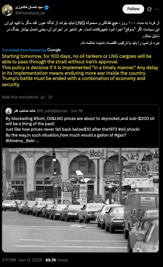 The most ominous signal yet came overnight in a post on X (formerly Twitter) from Ehsan Khandouzi, Iran’s former Economy Minister. While not an official government decree, his statement may reflect internal consensus—or act as a warning.