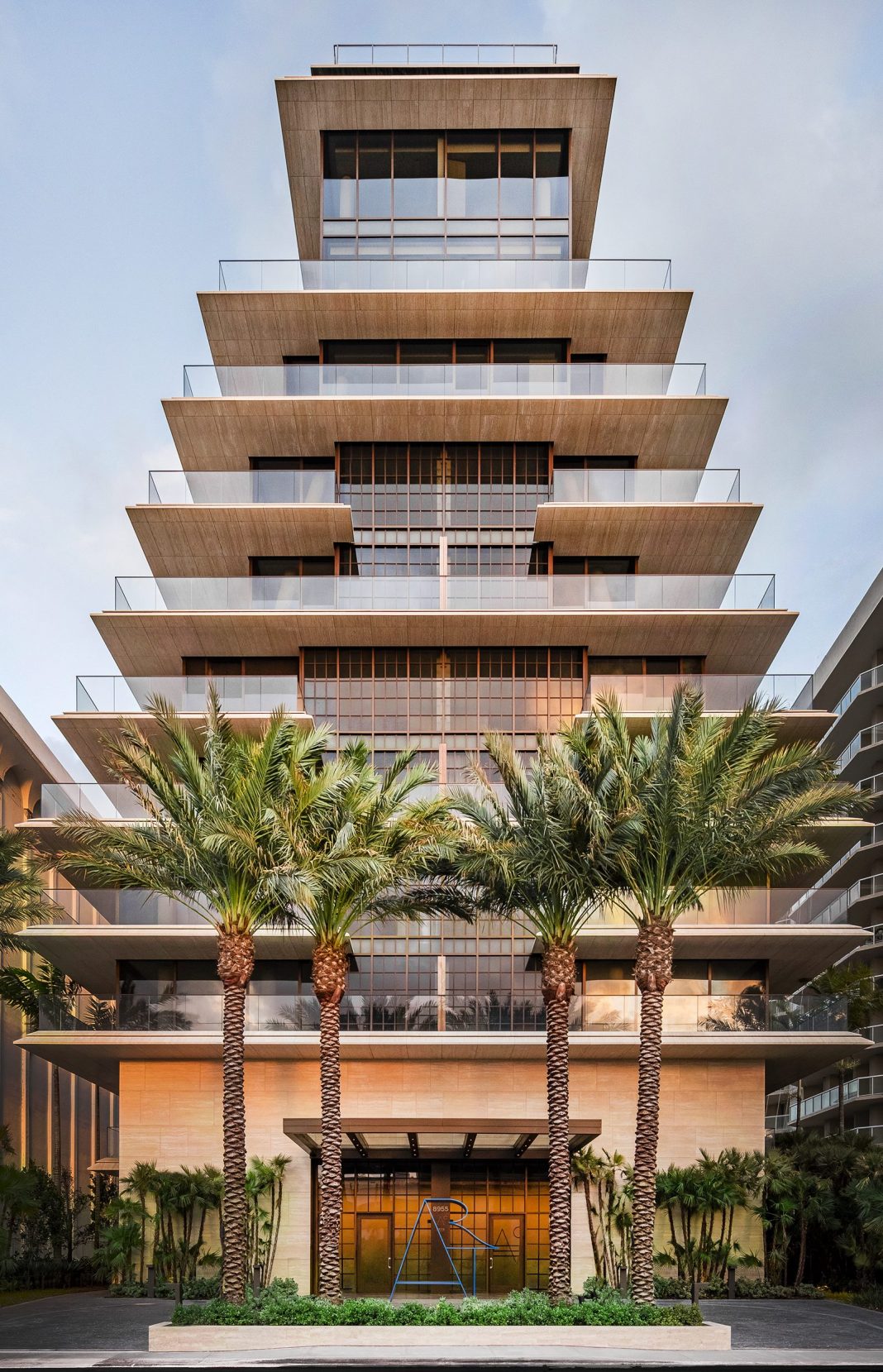 Soaring floor-to-ceiling glass windows allow the flow of abundant natural light and frame the prized views of the Atlantic Ocean and Miami skylines. Expansive, deep terraces with Brazilian ipe decking are wrapped in travertine and offer seamless indoor and outdoor living. Wide plank 11” European white oak flooring accentuates the impressive layouts and offsets the bronze detailing and architectural travertine seen throughout.”