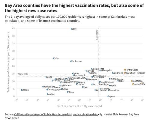 A Bay Area News Group analysis shows that not only are cases rising fast, they are rising in areas where there are more fully vaccinated people. Some of these counties have both among the highest vaccination rates, and the highest new-case rates.