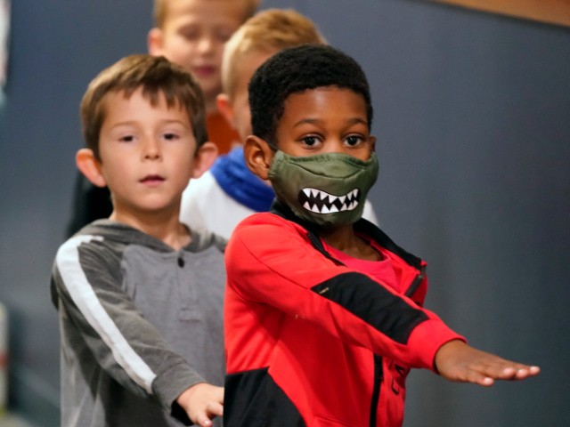 Students waking in the hallway at Tibbals Elementary School place their arms in front as a reminder to socially distance in Murphy, Texas, December 3, 2020. (AP Photo/LM Otero)
