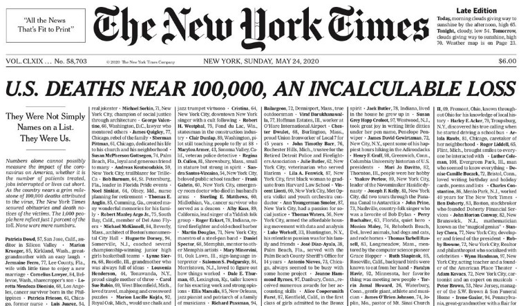 Though the Times used the number “100,000,” the actual death count on the newspaper’s own running count is just above 97,000 as of early Sunday morning.