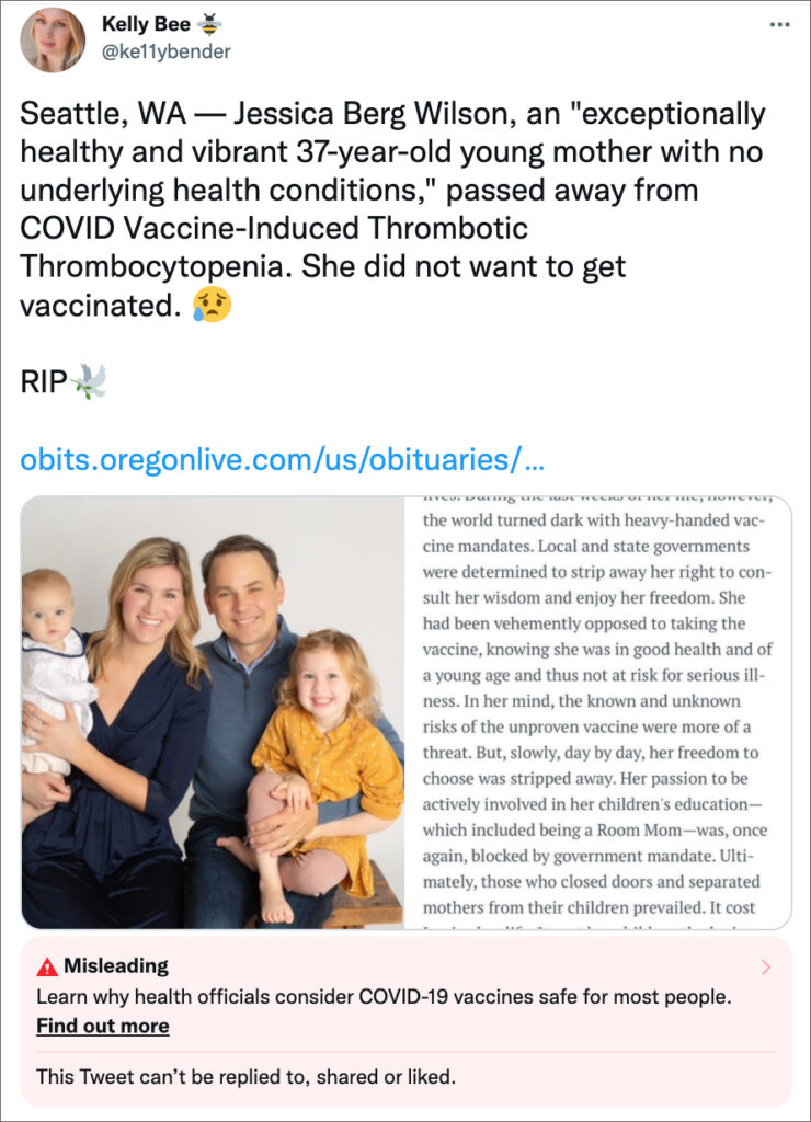 “Exceptionally healthy” 37-year-old Jessica Wilson died unexpectedly “from COVID-19 Vaccine-Induced Thrombotic Thrombocytopenia (VITT) surrounded by her loving family,” according to her obituary(LINK) published in Oregon Live on Saturday.