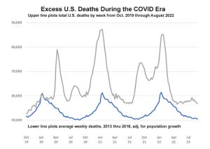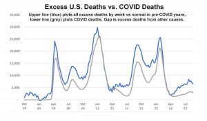 Overall, since the COVID-19 pandemic began, from April 2020 through August 2022, the CDC reported 1,044,323 COVID-related deaths. But so-called excess deaths during that period, even when adjusting for population growth, are 1.5 million. There are a half-million excess deaths in the United States that are unaccounted for. The usual suspects do not add up to that many.