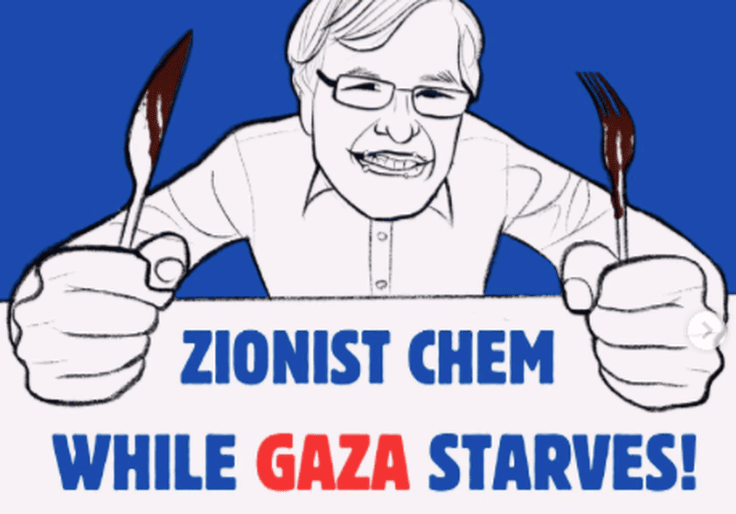 “This dinner is the prime example of a normalization PR event that hopes to distract students from Dean Chem’s complicity and support for the genocide of the Palestinian peoples,” the group said in a caption under the cartoon. “While Dean Chem wants to wine and dine his students, he continues to approve of UC investments into weapons companies like Blackrock, Lockheed Martin, RTX, Northrop, and more.”