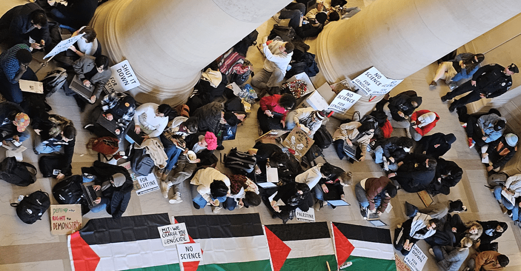 A left-wing group called Coalition Against Apartheid organized a large protest event in Lobby 7 of MIT’s campus in Cambridge, Massachusetts, a violation of university policy forbidding students from doing that due to safety concerns and fire hazards.