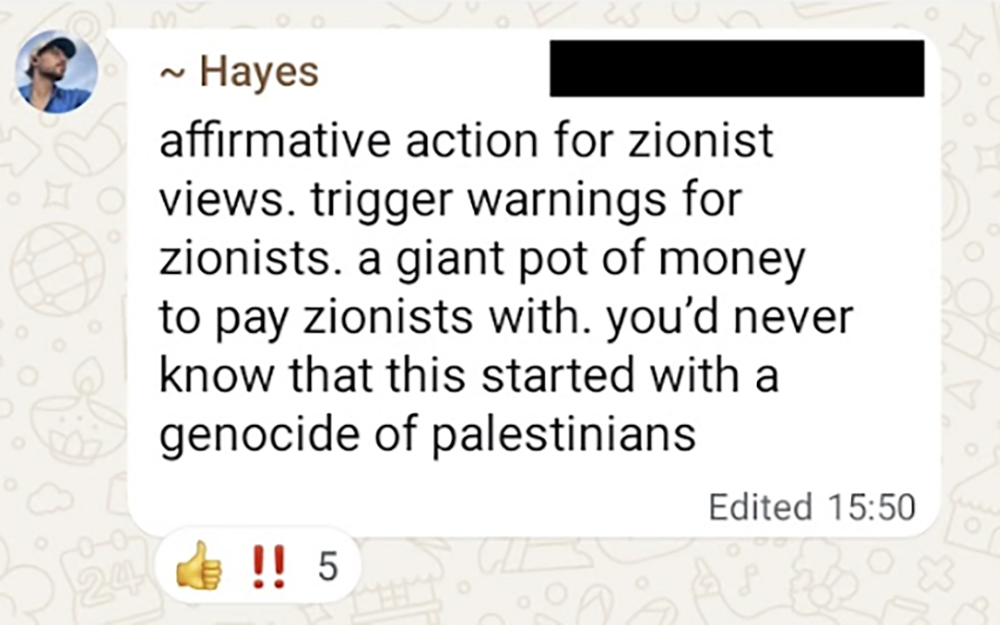 Hayes Buchanan, an architecture Ph.D. student, said the recommendation amounted to “affirmative action for zionist views,” “trigger warnings for zionists,” and a “giant pot of money to pay zionists with.”