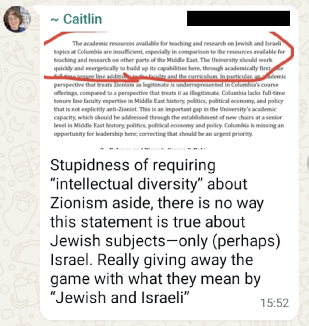 “Most of the anecdotes have a real ‘let me run to mom and dad and give them the least generous version of what happened’ sound to them…” Caitlin Liss, a history graduate student, wrote in the group chat. Liss also condemned the “stupidness of requiring ‘intellectual diversity’ about Zionism” and contemplated asking the report’s authors if she was required to “present some pro-colonialism viewpoint” in her Primitive Texts of Latin American Civilization class. The course, which fulfills Columbia’s “global core” requirement, serves as a “counterpoint” to a mandated contemporary civilization class, according to its course description.