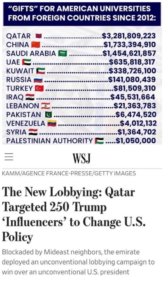 The image referenced includes a critical headline from The Wall Street Journal: “The New Lobbying: Qatar Targeted 250 Trump ‘Influencers’ to Change U.S. Policy.”