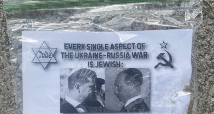 The flyer included an image of a yellow star reading “Jude,” which Jews were forced to wear in Nazi-occupied Europe during World War II, and images of Russian president Vladimir Putin and Ukrainian president Volodoymr Zelensky wearing skullcaps.