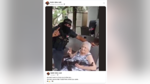 The Facebook group features numerous posts praising the actions of terrorism and minimizing harm done to Israelis. One photo shows a Hamas terrorist with an elderly Israeli woman with the caption, “We don’t want to throw you into the sea…we want to ride it back from where you came.”