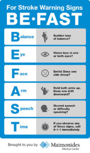 The National Stroke Association provides a useful acronym to help identify stroke symptoms and respond quickly, “BE FAST.” In the event someone might be experiencing a stroke, be sure to observe these crucial signs: