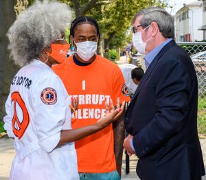 In July 2021, Northwell Health President & CEO Michael Dowling and other representatives met with LIFE Camp co-founder Erica Ford, left, and visited the organization’s “peace mobile,” a mobile trauma unit that provides therapeutic wellness, conflict resolution and mediation training services to communities throughout the city that have been impacted by gun violence.