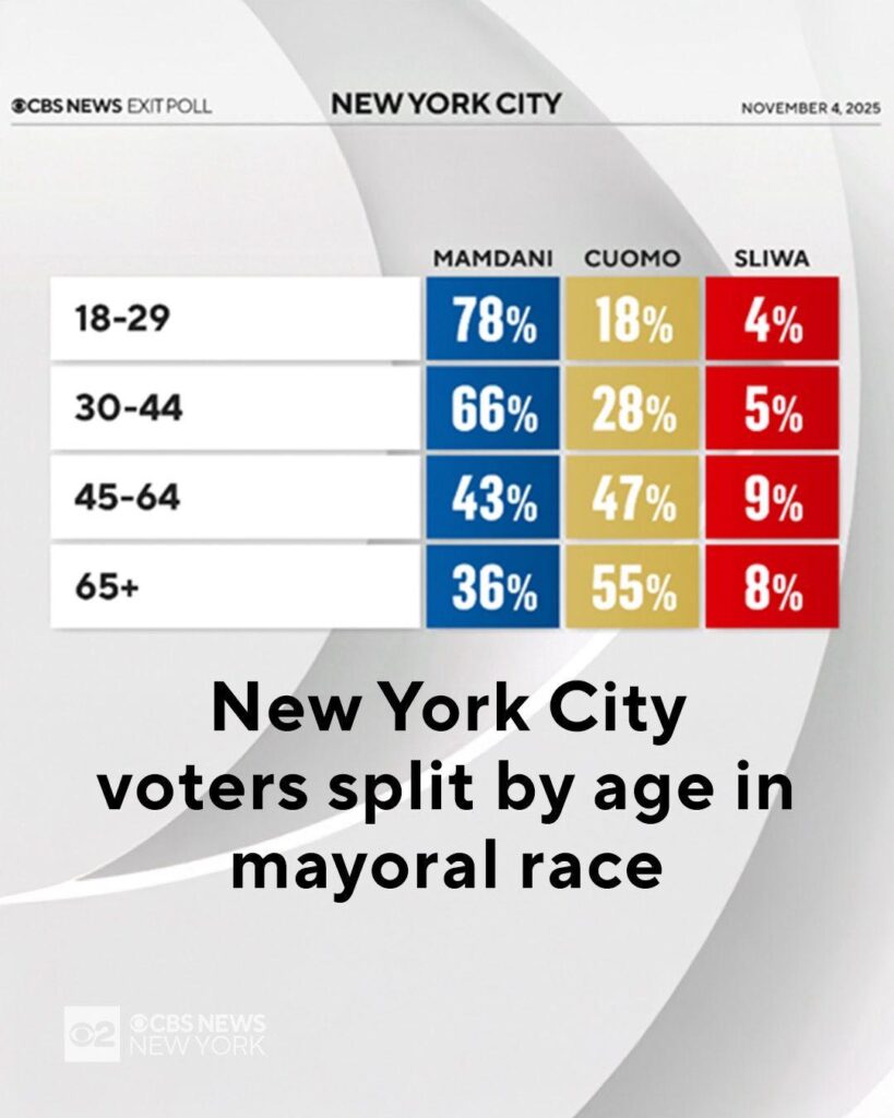 The results of New York City’s 2025 mayoral election have underscored a stark generational divide that speaks volumes about the city’s shifting political identity. According to a CBS News Exit Poll released on November 4, 2025, the race between Zohran Mamdani, Andrew Cuomo, and Curtis Sliwa fractured sharply along age lines, revealing a city where political ideology appears increasingly dictated by generational worldview rather than geography or class.