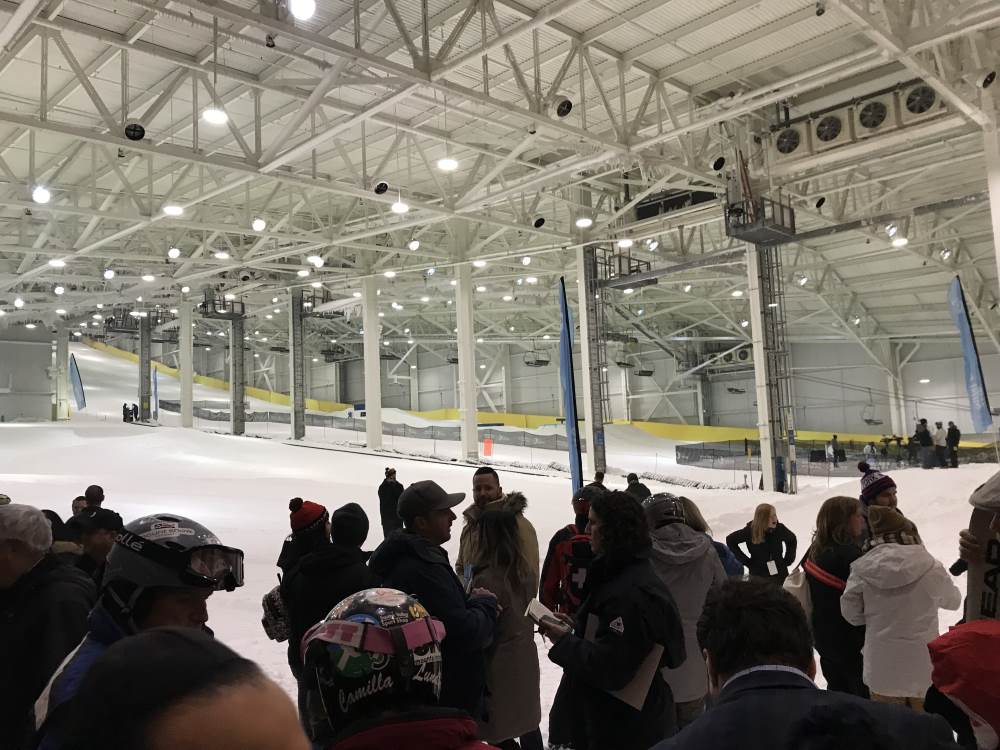 The media was allowed inside the 16-story, 180,000 square-foot indoor ski and snowboard park for a first look before the public slid down the slopes later on Thursday.