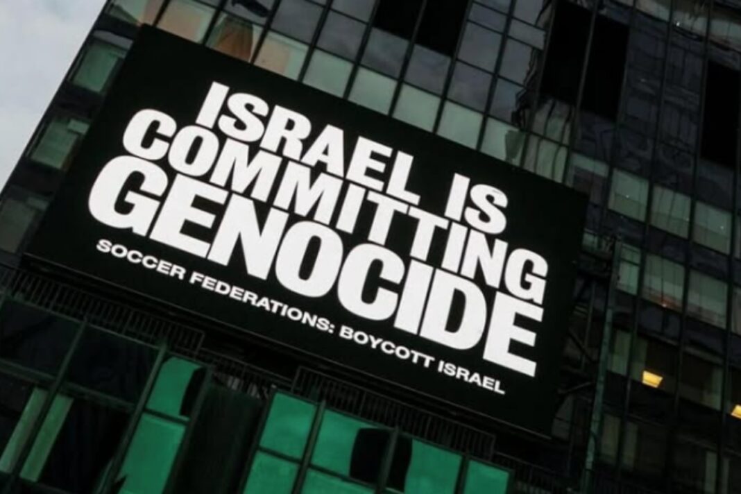 The campaign’s website encourages supporters to share promotional materials, such as an image featuring a bloodied soccer ball adorned with an Israeli flag and the slogan: “Block the genocide: Boycott Israel.” The billboard near the intersection of Broadway and West 43rd Street also accuses the Jewish state of committing genocide.