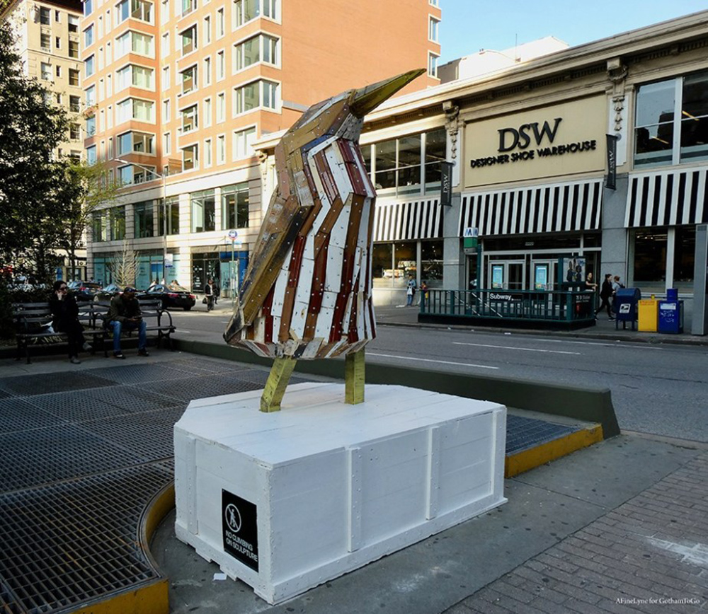 Each sculpture will be made out of 100% reclaimed or recycled wood, kickstarter.com noted. “Through a partnership with Big Reuse, the artist will receive salvaged lumber to be used for each bird. Holiber will also reprocess found wood from around the streets of New York City. Additionally, sponsorship for all of the hardware needed to build the sculptures has been provided by Marjam Supply Company.”