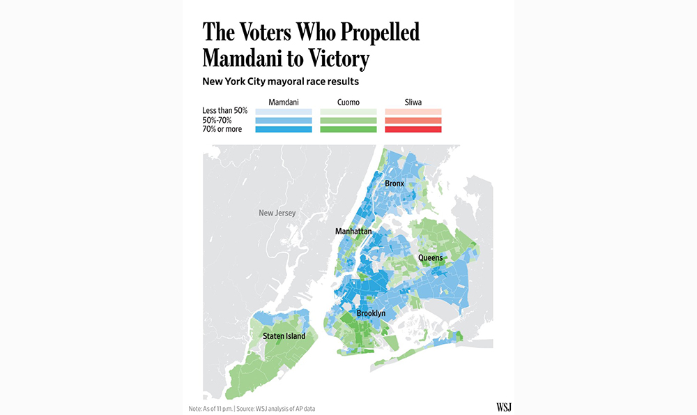 A similar pattern emerged in Brooklyn Heights, where of 6,652 Jewish-surnamed voters, 4,026 favored Mamdani compared to 2,366 for Cuomo. In Cobble Hill, 2,980 out of 4,515 Jewish-named voters went for Mamdani, while 1,421 chose Cuomo. These neighborhoods — populated largely by professionals, academics, and interfaith families — form the ideological core of the city’s Jewish progressive movement.