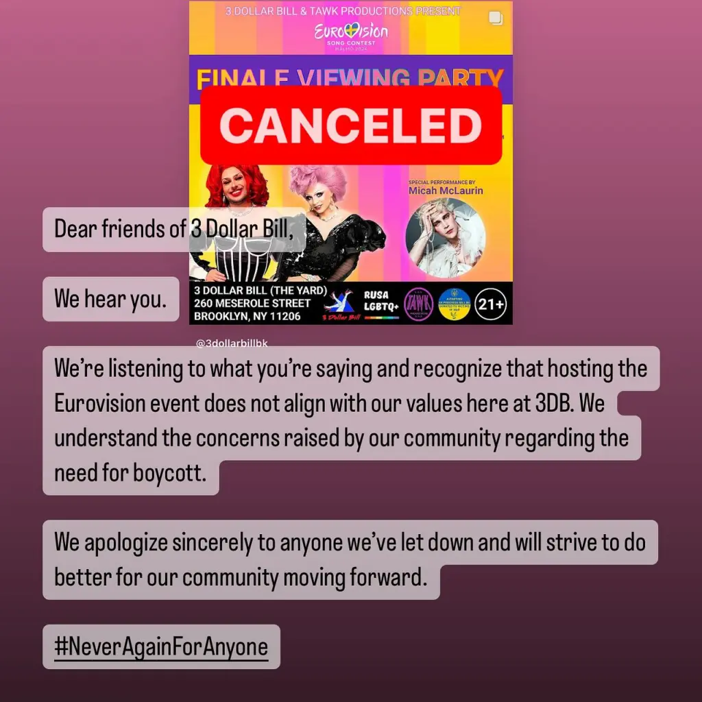 A Brooklyn bar, 3 Dollar Bill, situated in East Williamsburg, finds itself embroiled in a firestorm of criticism after it abruptly scrapped plans to host a viewing party for the Eurovision Song Contest, NY Post noted.