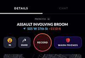 The app, which is now available in 30 cities, including NYC, the San Francisco Bay Area, Baltimore, Los Angeles, Philadelphia and Chicago, was developed by sp0n, Inc. It alerts users with location-based real-time safety alerts, news updates and live videos. Citizen employees monitor 911 communications using radio antennas, to create the alerts. The app reportedly has over seven million active users. Originally named Vigilante when it came out in 2016, the app had been criticized as being an enabler of mob justice.