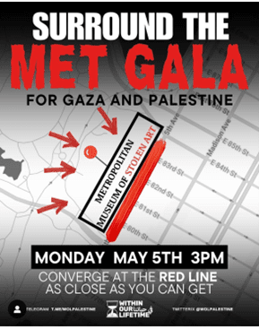 CSI has been made aware that a social media campaign promoted by Within Our Lifetime – United for Palestine (WOL) urging recipients to “Surround the Met Gala for Gaza and Palestine” tomorrow at 3 pm. The group further encourages participants to “Converge at the RED LINE…as close as you can get.”