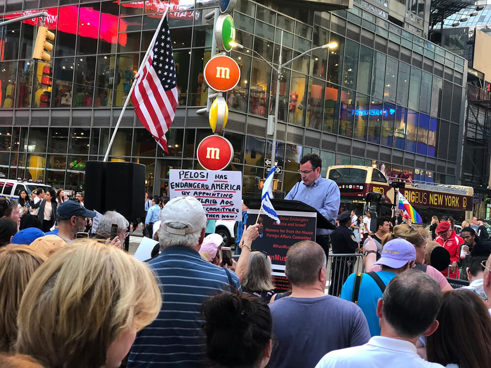 Several hundred people gathered for the rally and billboard launch in Times Square, as one speaker after another cited the existential danger in the vitriolic Jew hating and Israel bashing rhetoric that is routinely spewed for by Rep Omar.