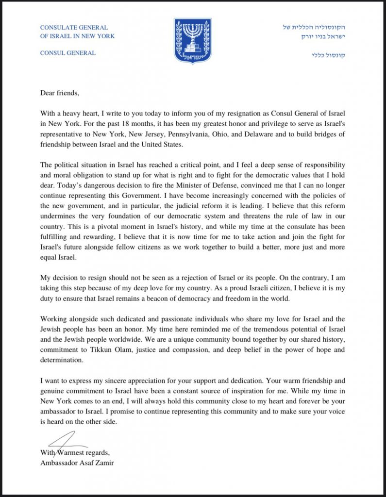 Israel’s Consul General in New York, Asaf Zamir, announced on Sunday his resignation in protest over Prime Minister Benjamin Netanyahu’s firing of Defense Minister Yoav Gallant who publicly criticized the judicial reform bill in the Knesset.