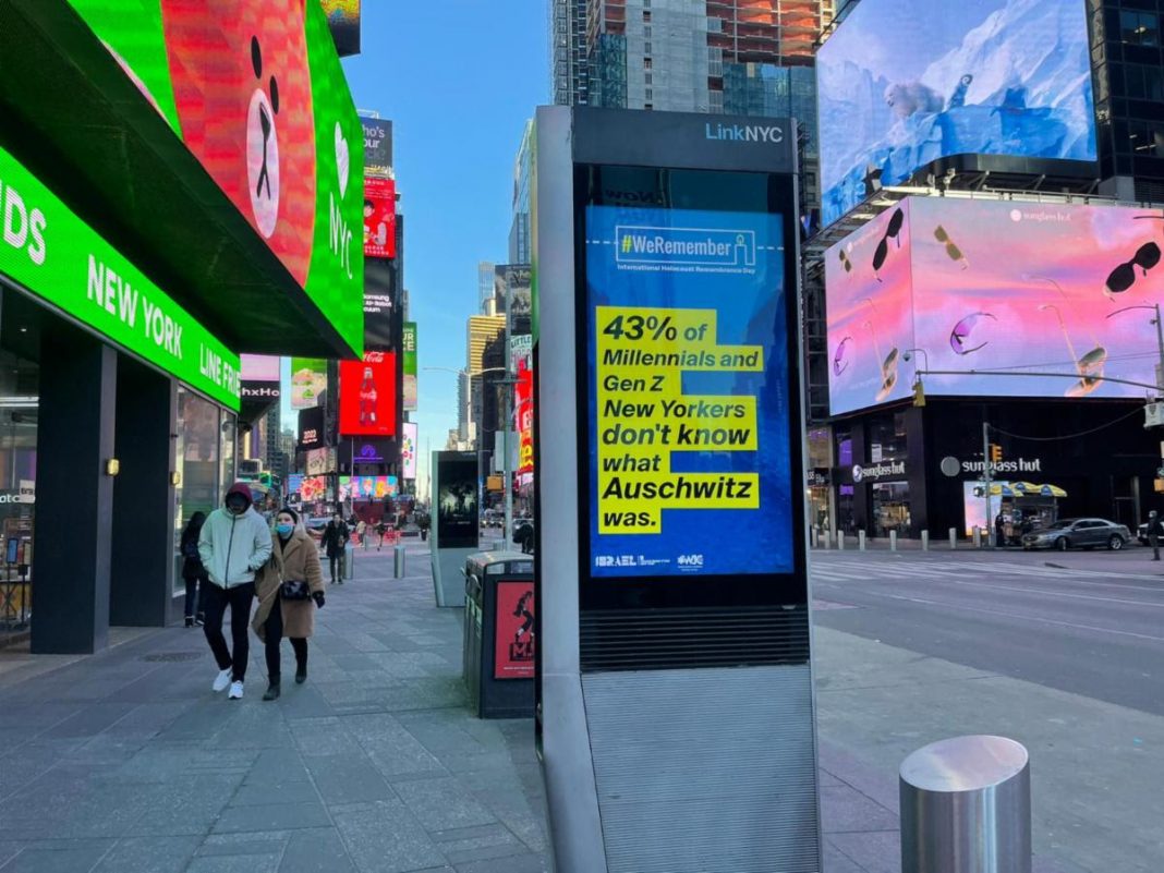 Through a new initiative, which is a component of WJC’s global #WeRemember campaign, there will be 66 LinkNYC kiosks throughout New York City on Thursday that will display statistics on antisemitism. The LinkNYC hotspots will provide awareness of basic facts related to the Holocaust in order to combat the lack of knowledge about the Holocaust.