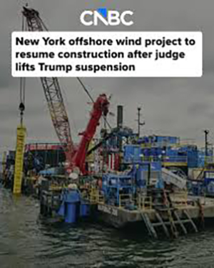 As the New York Post reported, construction on one of New York’s largest offshore wind projects is back on track after a federal judge temporarily blocked the Trump administration’s effort to shut it down, ruling that the suspension risked inflicting fatal damage on the development.