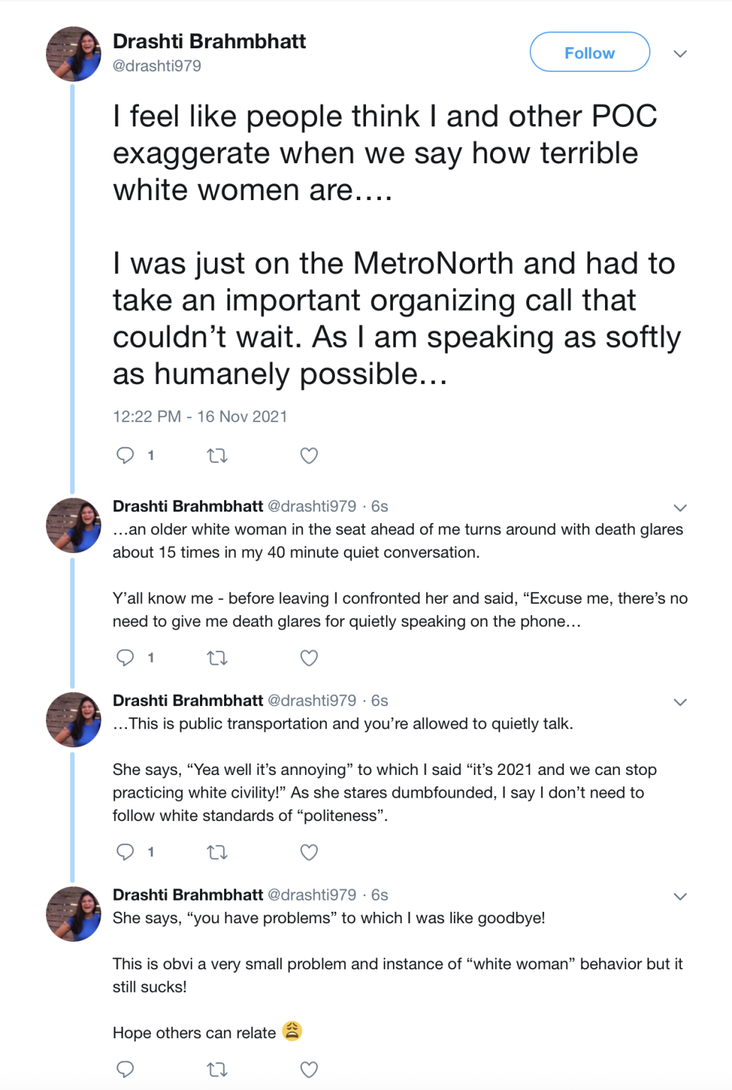 Brahmbhatt has also posted about “how terrible white women are” while telling a story about a woman glaring at her for taking a meeting on a train.
