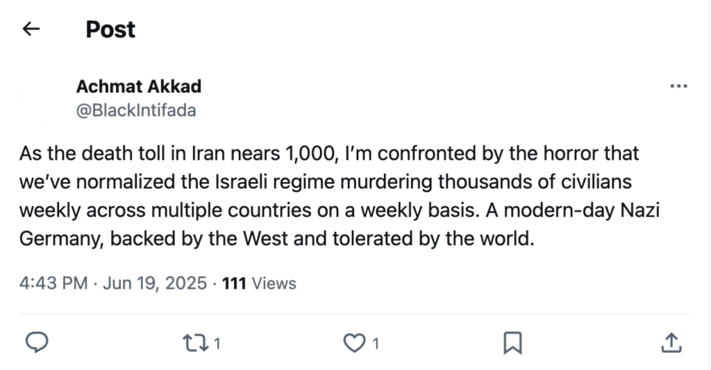 Akkad wrote in a June 2025 post on X that Israel is a “modern-day Nazi Germany” and in a May 2025 post that “Zionism is fascism.”