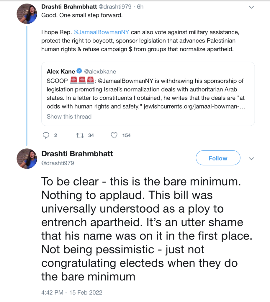 She instead called on Bowman to “vote against military assistance, protect the right to boycott, sponsor legislation that advances Palestinian human rights & refuse campaign $ from groups that normalize apartheid” and referred to the resolution as “a ploy to entrench apartheid.”