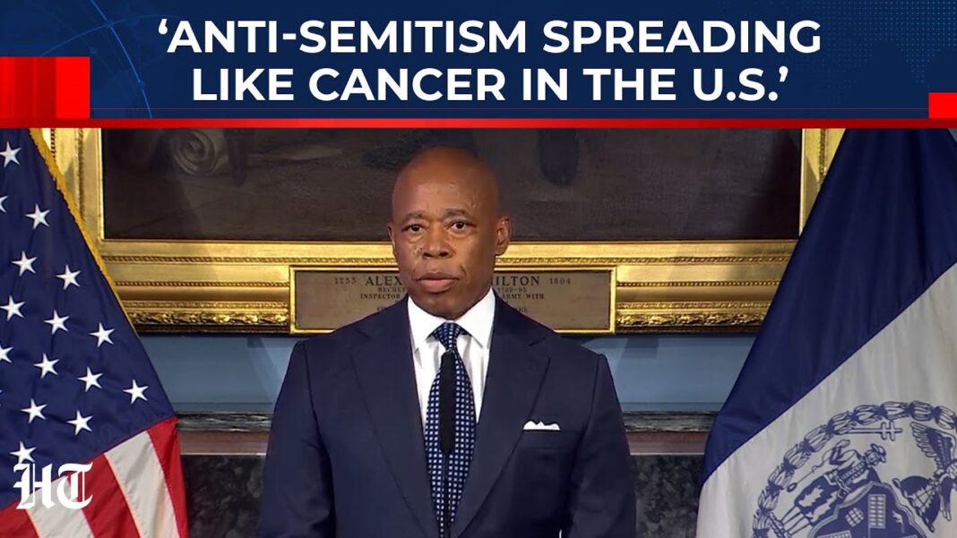 Mayor Eric Adams delivered one of his most impassioned defenses of New York City’s Jewish community on Thursday, forcefully condemning a surge in antisemitic incidents and warning that anti-Jewish hatred is spreading “like a cancer across our city.” His remarks came amid a storm of public outrage over an unsanctioned art installation on Governors Island that displayed grotesque, antisemitic imagery — including a Star of David superimposed on a Ku Klux Klan hood and comparisons of Zionism to Nazism.