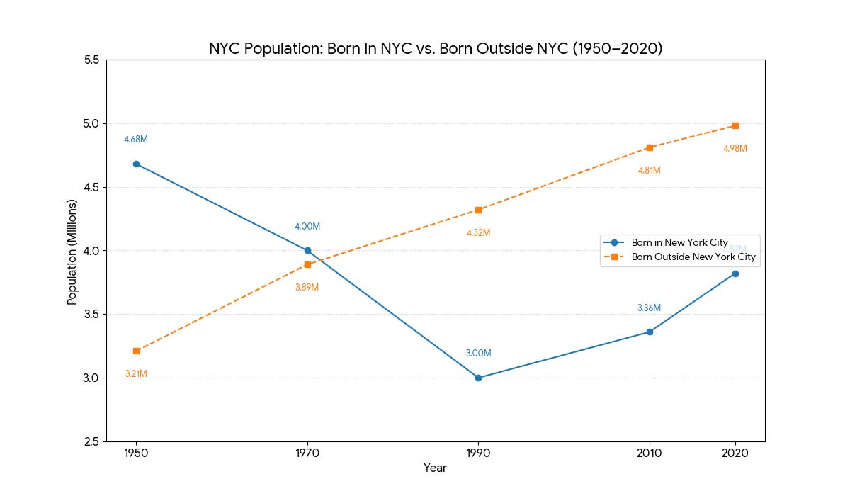 5 million residents were born outside New York City. Less than 4 million were born in the city.