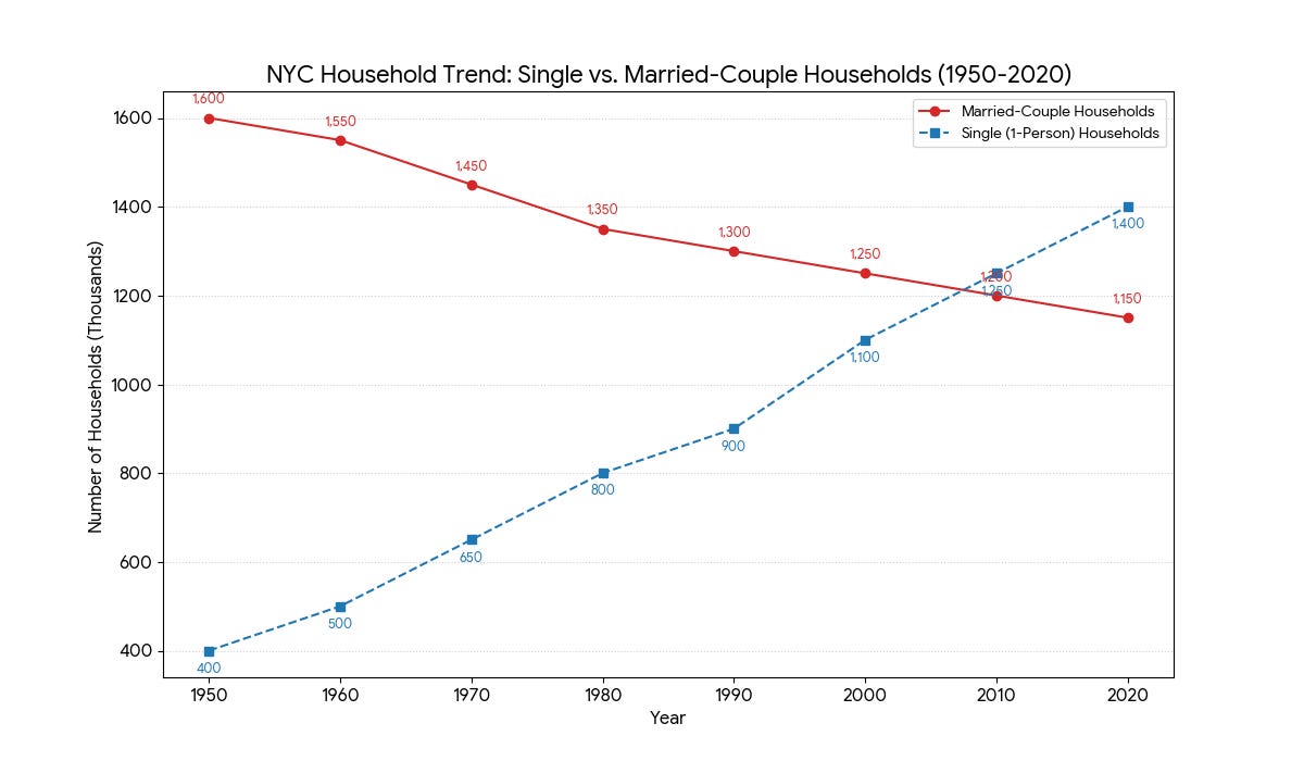 The college students who moved to the city and got jobs here were less likely to get married and form families leading to Manhattan becoming one of the largest (and certainly the densest) reservoirs of singles in the country. Combined with the growth in ‘single parent’ households among minority groups, the New York City of families has disappeared.
