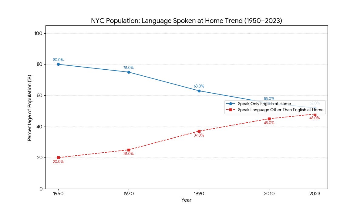 This reflects both external mass immigration but internal migration from other parts of the country. Another way to measure the foreign population in New York City is to look at the proportion of those to whom English is a second language. The number of non-English speakers has been steadily rising since 1990 and the number of English speakers declined from 63% to 52%.