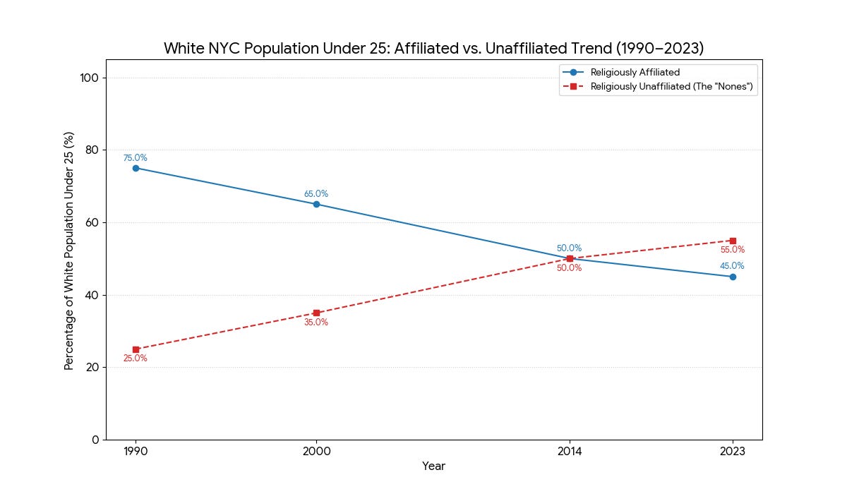 The religiously affiliated are still a majority, but the numbers of the religiously unaffiliated have been rising sharply. Among those 45 years old and younger, the group that Mamdani won, the gap is 60% to 40%. The gap is narrower still, 55% to 45%, among those under 30, and among those under 25 years old, it’s split evenly. Among white New Yorkers, a majority are unaffiliated.